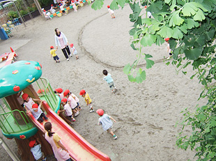 登園したら朝の8時30分をめどにみんな一斉に外へ出て外遊び。朝の気持ちのいい空気を吸い、朝の日光を浴びて外遊びをすることはお子さんたちにとって大切なことです。