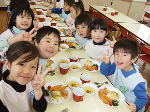 お昼はきれいなランチルームで。ただランチルームは全員一緒には食べられませんので2歳・3歳児は最初に、次に年長・年中児と2つにわかれておいしく楽しく頂きます。